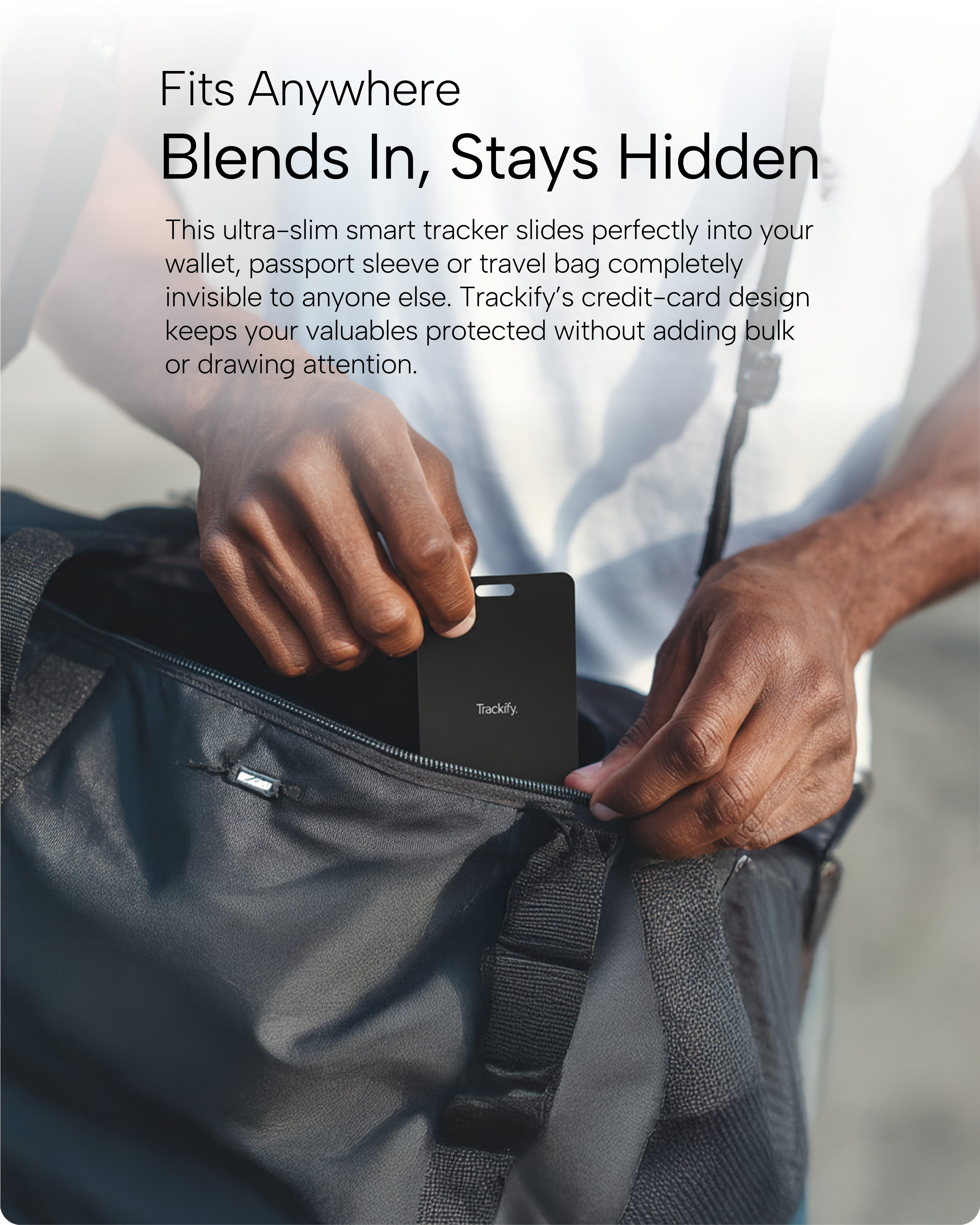 1. Slide Trackify into your wallet, passport sleeve, or bag. At just 1.8mm thin, it hides into any card slot.